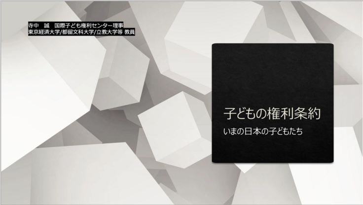 まず寺中理事の話は、日本の歴史背景をたどりながら法の観点から、子どもの権利についてわかりやすく現状を説いたものでした。