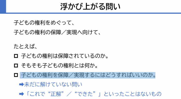 ・子どもの権利はHowもそうだけれど問いを常に立て続けることが大切だということがとても参考になりました。
