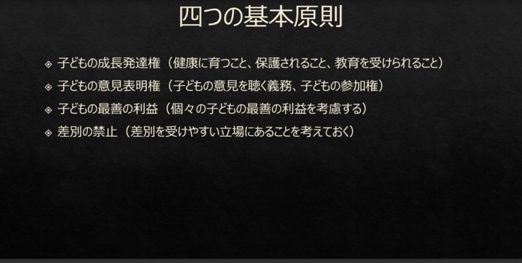 子どもの権利を守るためには、ただ法律や制度を整えるだけでは不十分です。大人は、子どもが安心して意見を表明できる環境を整え、その意見をしっかりと聴くことが大切だと思いました。また、不登校や虐待といった問題に対しても、子ども一人ひとりの権利を尊重し、最適な支援を行うことが重要です。