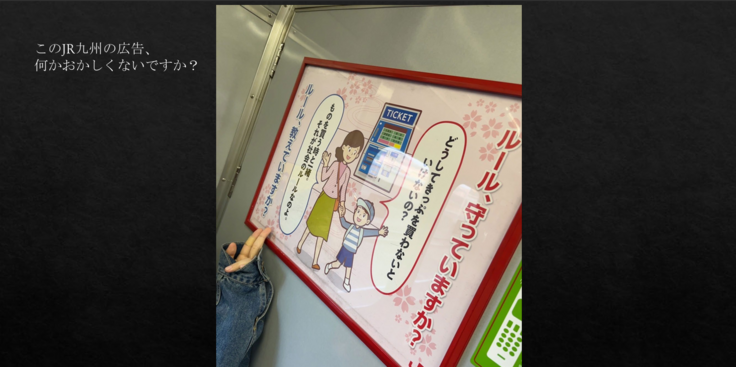 画像には、「どうして切符を買わないといけないの?」と少年が質問しているのに対して、女性が、「ものを買うときと一緒。それが社会のルールなのよ。」述べていたと思います。この広告の疑問点として、「社会のルールだから」という回答だとそのルールがなぜ存在するのか、そのルールを守ることがどんな意味を持つのかが分かりにくいと思います。そして、ルールに関する理由や目的を説明しきれていない点が広告の疑問点として、考えられます。このように、1つの画像から日本の社会のルールや仕組みについて考えることができます。これが私の印象に残った部分です。