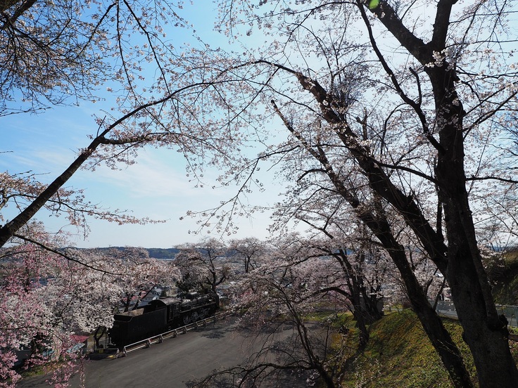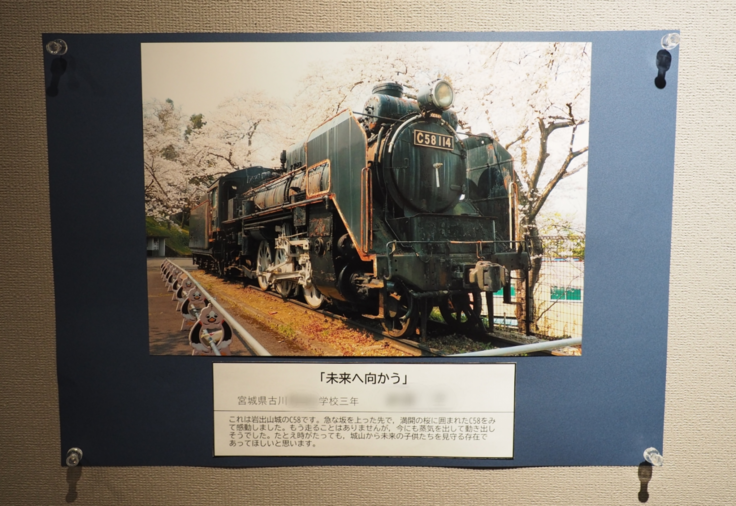 「これは岩出山城のC58です。急な坂を上った先で、満開の桜に囲まれたC58をみて感動しました。もう走ることはありませんが、今にも蒸気を出して動き出しそうでした。たとえ時がたっても、城山から未来の子供たちを見守る存在であってほしいと思います。」