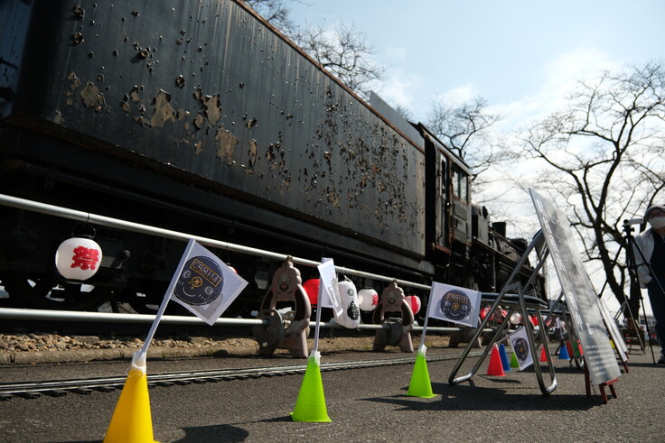 線路脇ではマスコットキャラクターのシゴハチ君(仮称)の旗と、シゴハチさん(ご本人)がお出迎え!!