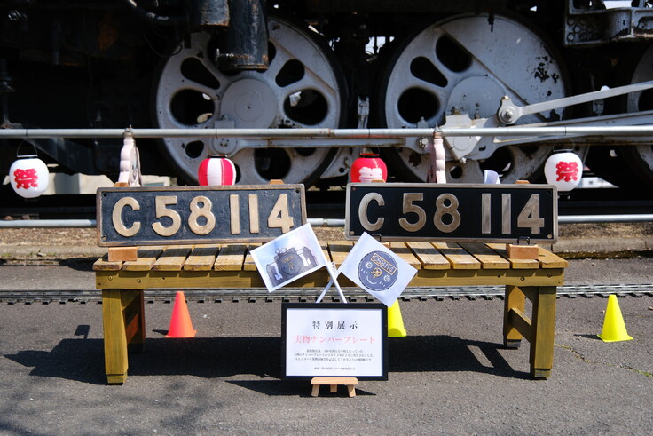 特別展示として50年ぶりに発見されたC58114の本物のナンバープレート(左)と、今回の整備のために国鉄指定銘板工場様にて製作したナンバープレート(右)がお目見えです✨