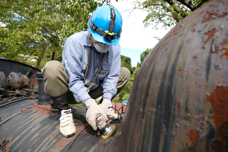 ボイラー上部の高所ではベテランの方々が電動工具で錆を落としてくださいました♪