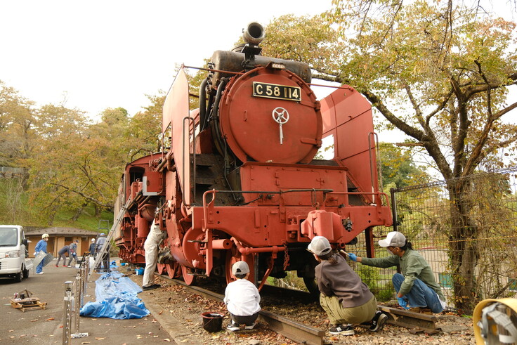 こちらは西古川地区で解体となったC58形19号機から取り外した「煙室扉ハンドル」を取り付けて頂いている様子です。