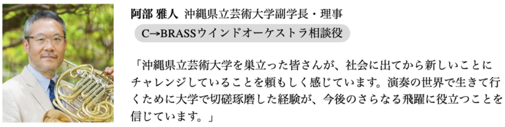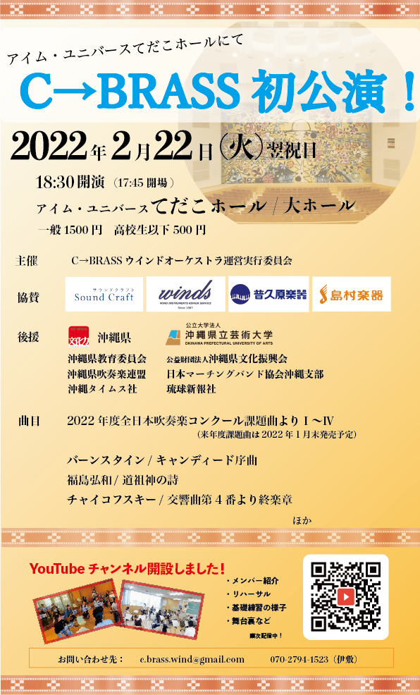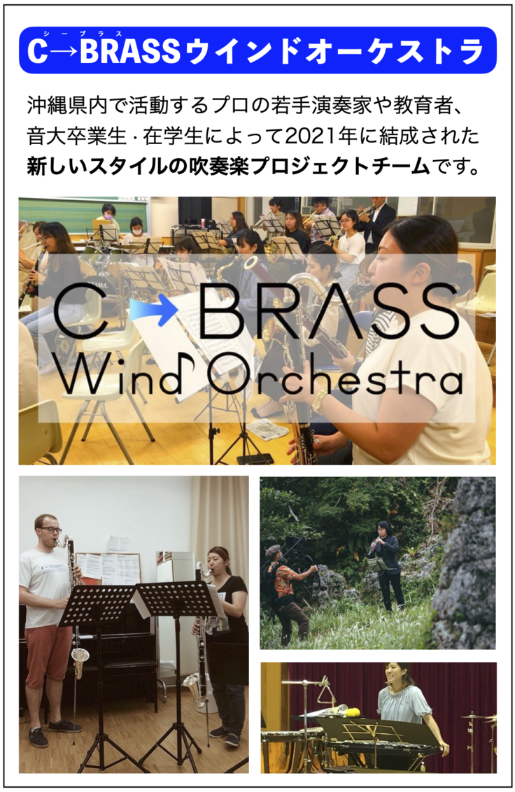 C→BRASSウインドオーケストラは、沖縄県に尽くすこと、未来ある子どもたちの教育、若手音楽家の活躍の場の創出を目的に、2021年夏に結成された吹奏楽プロジェクトチームです。プロ、教育者の垣根を越えて、演奏の専門的技術のある人間が集まるハイブリッド集団を目指しています。