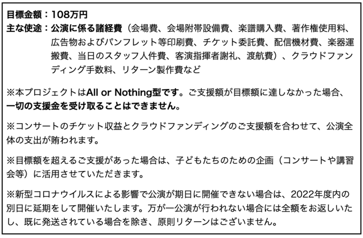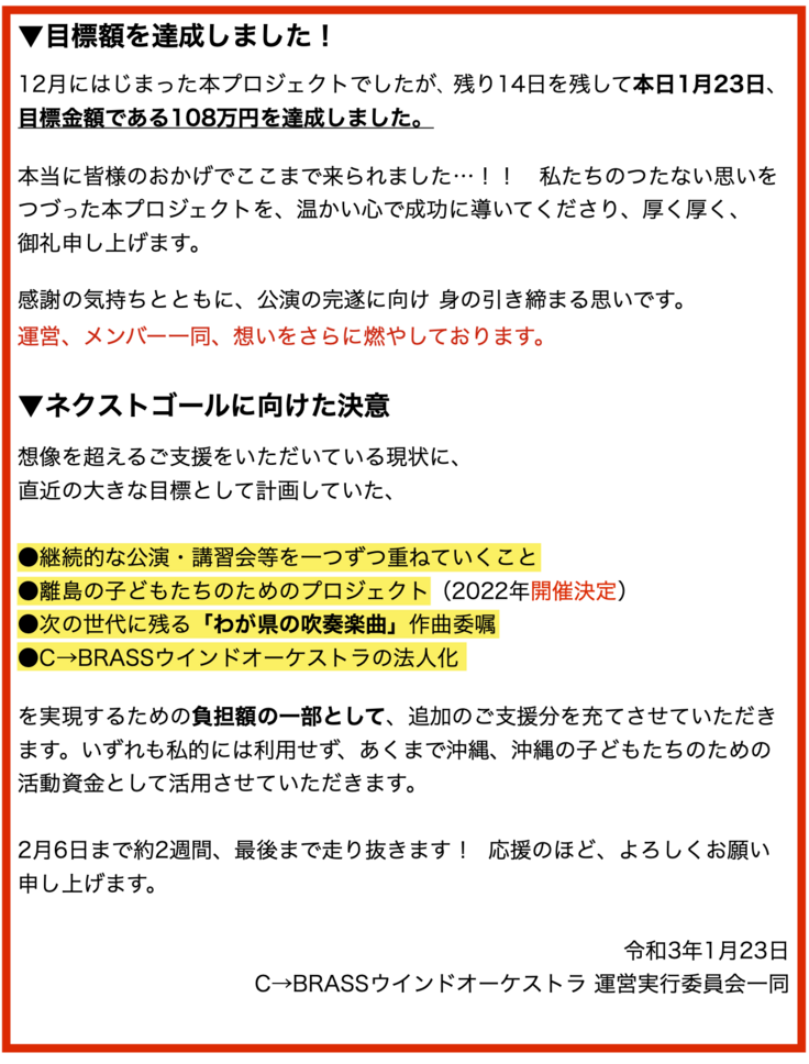 C→BRASSウインドオーケストラが「結成記念1stコンサート」を行います。会場費、会場附帯設備費、楽譜購入費、著作権使用料、チラシ、パンフレット等印刷費、配信機材費、楽器運搬費、当日スタッフの人件費、客演指揮者謝礼、渡航費、クラウドファンディング手数料、リターン制作費など、公演に必要な諸経費(全経費の一部)に充てさせていただきます。 ※目標額を超えるご支援があった場合は、子どもたちのための企画(コンサートや講習会等)に活用させていただきます。 ※新型コロナウイルスによる影響で公演が期日に開催できない場合は、2022年度内の別日に延期をして開催いたします。万が一公演が行われない場合には全額をお返しいたします(その場合、原則リターンはございません)