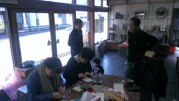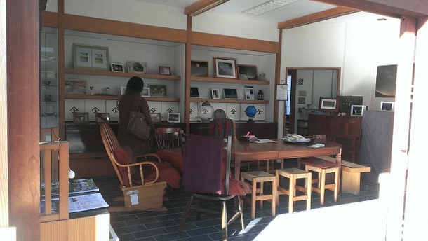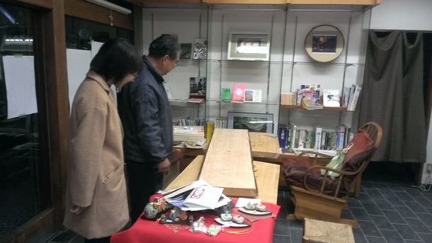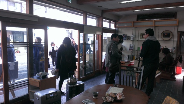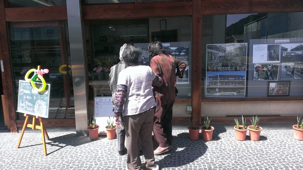 ご近所のおばあちゃんたちとお客さんのおばあちゃんが、展示中の昔の笠間の写真とこの前笠間高校写真部員が撮ってくれた通り沿いの写真を見てお話しているところ。