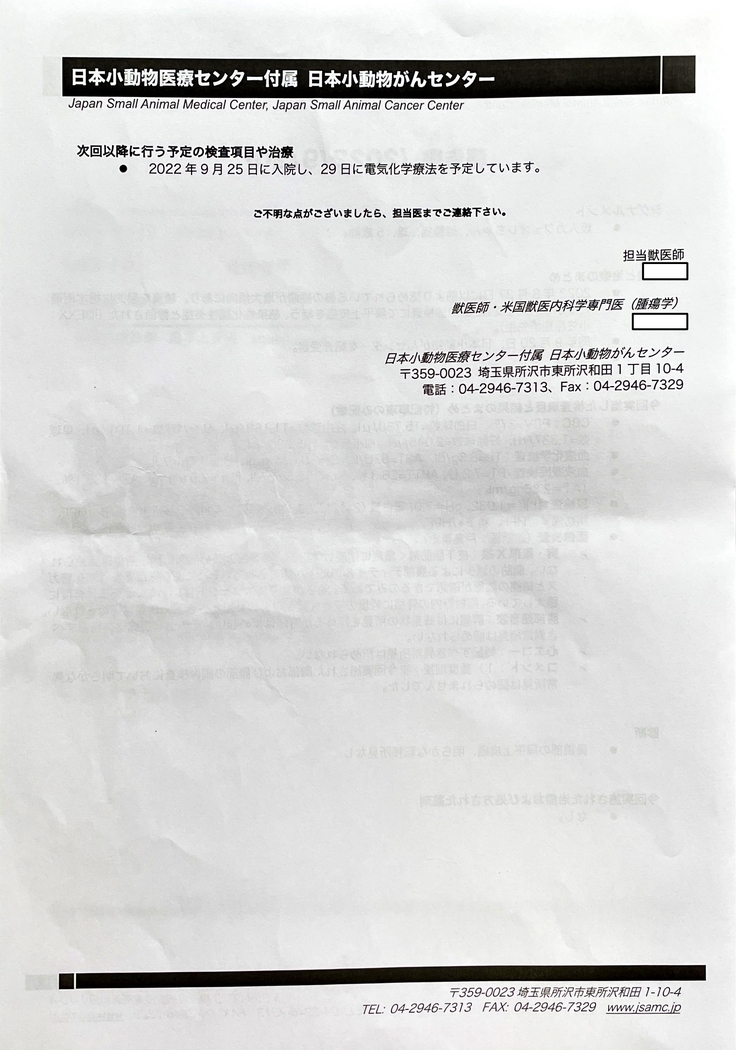今後の治療方針としては、抗がん剤を用いた電気化学療法を行う方向で話がまとまりました。