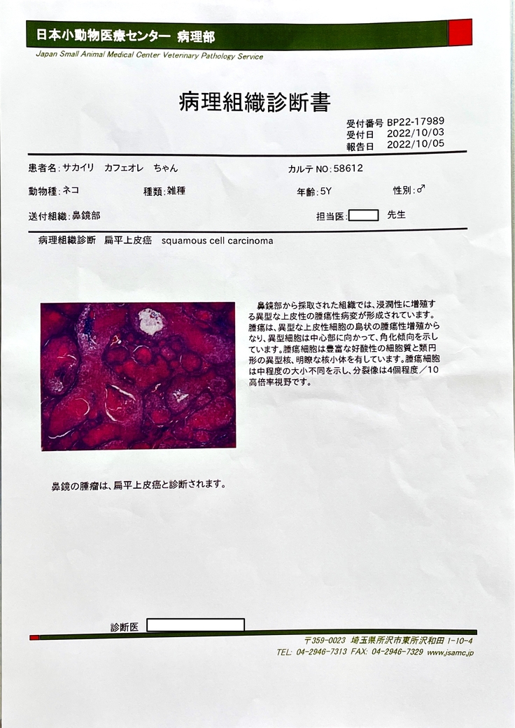 やはり扁平上皮癌の疑いが高く、ほぼ間違いないとのことでした。