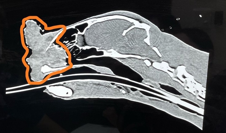 △CT画像。オレンジの部分が癌で、鼻の奥まで浸食していることが確認できます。