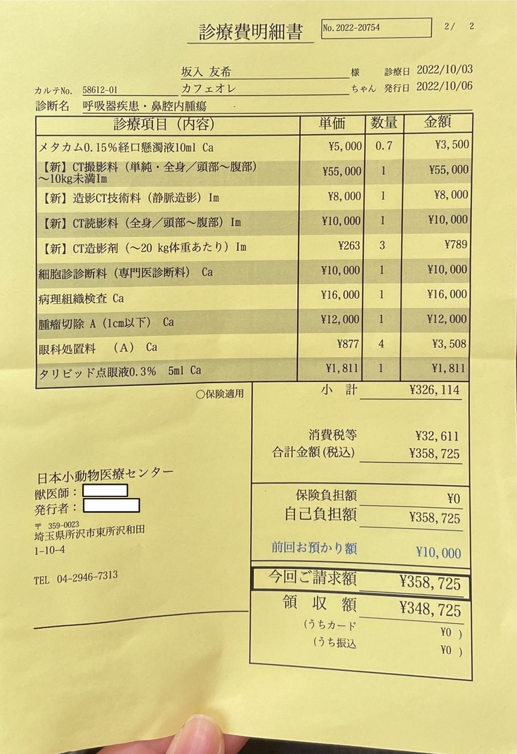 ※動物病院を受診したのが母なので、診断書及び明細書等の宛名は母の名前になっています。