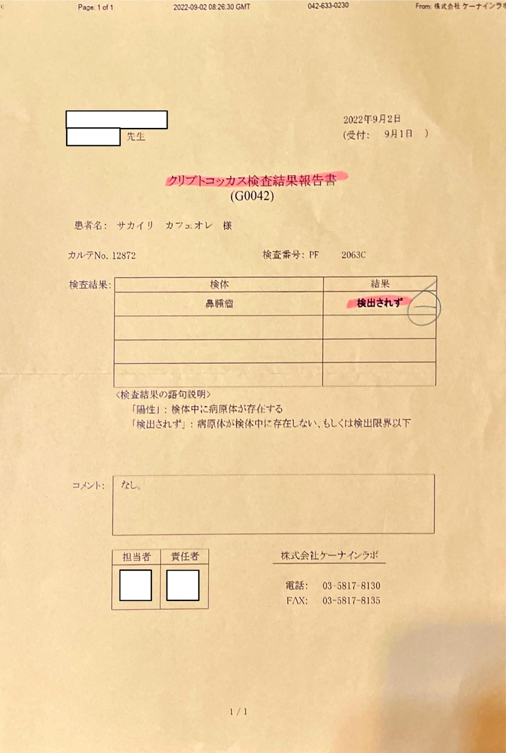 クリプトコッカスの検査も行いましたが、病原体は検出されませんでした。