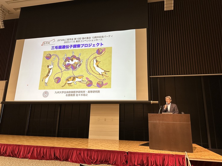 プロジェクト代表の佐々木が、JSFMねこ医学会の10周年記念パーティに招待され、「三毛猫遺伝子探索プロジェクト」について講演してまいりました。