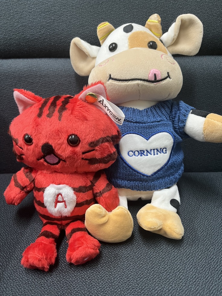2枚目:コーニングさんからいただいたアキシニャンとウシさんのぬいぐるみ。なんとウシさんがミケ!笑