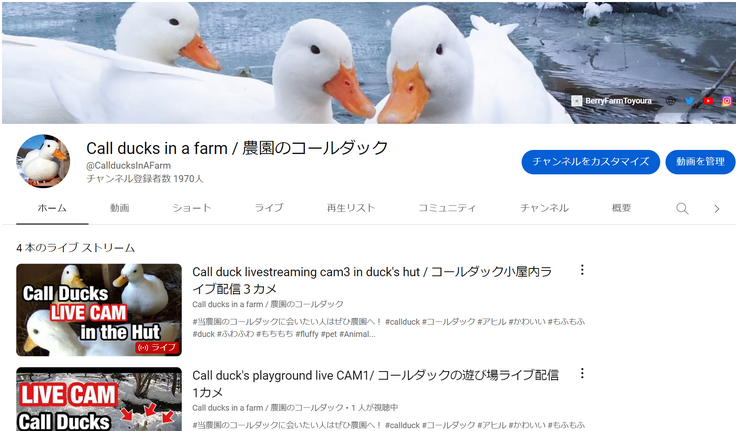 コールダック達は園内の池で過ごしており、Youtubeライブ配信を通じて日本中だけでなく海外の方にもご覧いただいています。