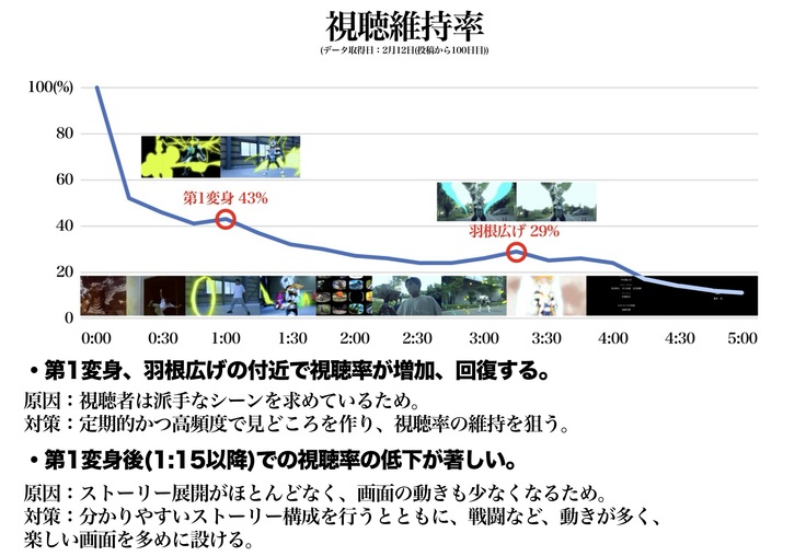 自主制作版では、コンセプチュアル(=概念的)な表現を重視しすぎるあまり、伝わらないこと、分かりにくいことが多くあり、内容の面では退屈な作品となってしまいました。画像は、自主制作版の分析会において使用した「視聴維持率」に関するスライドを再編成したものです。