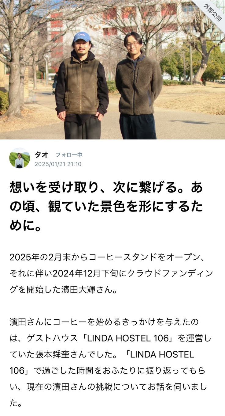 コーヒースタンド開業の大きな原体験を与えてくれた張本 舜奎 さんとの対談記事を公開しました!