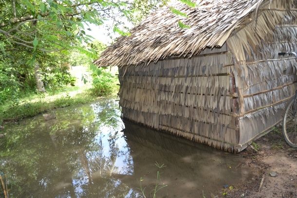 すぐ後ろに大きな水たまりができていました。私が訪問したときは雨季が終わってしばらくしたときなので、「雨季の間はどうなるんだろう・・・そっかだから床が高床式みたいになってるのか」と理解しました。