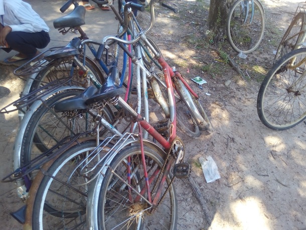 こちらがどこの学校にでもある壊れて使えなくなった自転車。日本ですとここまで乗ったらもう廃車かもしれませんが、カンボジアでは「まだまだ使えるんだけど・・・修理用のパーツがないんです」ということで放置されています。「学校に修理道具と交換用パーツがあればたくさんの自転車が復活する!」というわけです。