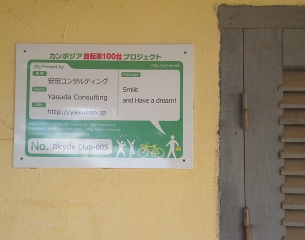こちらが自転車クラブプレート。修理パーツを保管する倉庫の入り口に取り付けられています。安田の支援したクラブはNo.005。001から004はご協力いただいた人たちによって設立された自転車クラブ。各中学校に同じようなプレートが取り付けられています。