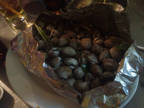最後に食べたコイツ・・・お店のメニューによると「ボイルドオイスター」。カキではない何かの貝・・・まぁいっか。ホイル蒸しだよねぇ・・・アルミホイルをやぶいてみると生ぬるいしほとんどの貝は開いていない・・・普通食べません・・・でも食べちゃったんですよね・・・そのあとこのカンボジアの旅は最終日まで私のお腹はえらいことになっていました(^_^;)