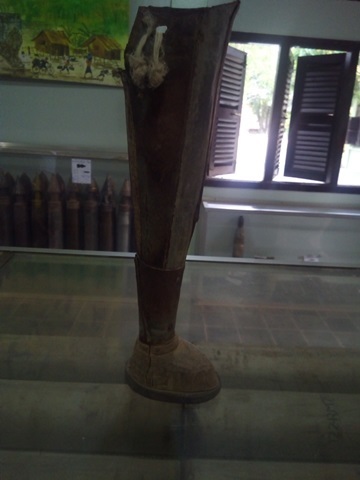 こちらが当時の義足。これで歩くの痛いだろうなぁ。カンボジアは今は内戦も終わっていますがまだ埋められた地雷がたくさんあります。駆除は少しずつしか進みません。まだ何万個と埋められていると推測されています。これはカンボジアだけではありません。世界の色々な国が同じことになっています。そして、まだ戦争で地雷が埋められています。ということは地雷を作っている国や企業もあるということです。