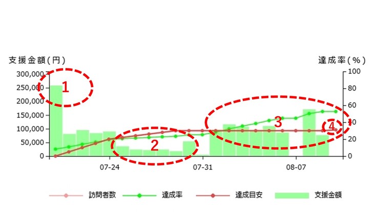 クラウドファンディングは最初の5日を過ぎたらいったん落ち着きます。それが2のエリア。ここでも毎日新着情報を更新するなど情報発信の継続が大切。それでも毎日ご支援のお申込みをいただきました。ただ、安田の気持ちはあせるばかり。それは赤の折れ線(達成目安)にどんどん差をつけられていたからです。ここに何とか追いつけないかと・・・