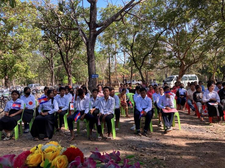 今日お邪魔しましたのはプレアヴィヘア州ROVIENG郡にありますRAKSMEY REK RAY中学校です。開催地となった中学校と合わせて合計10の周辺中学校から50名の生徒さんが選ばれ自転車を贈られることになりました。こちらセレモニーの様子の写真です。