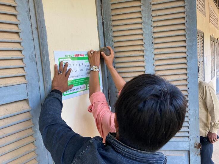 撮影が終わりましたら、あわただしく次の行程。自転車クラブの設立です。まずは看板の取り付け。そういえば、今年も看板作成をお願いしましたのは和歌山市のメイク広告さん。自転車プロジェクト初年度からお願いしています。そして今年看板の材質を変えてみました。雨ざらしにならないところという条件で軽量化を図りたいと相談したんです。軽量化が必要なのは飛行機で預け荷物として運ぶため。看板も補給の方と合わせて35枚持参することになりましたので・・・