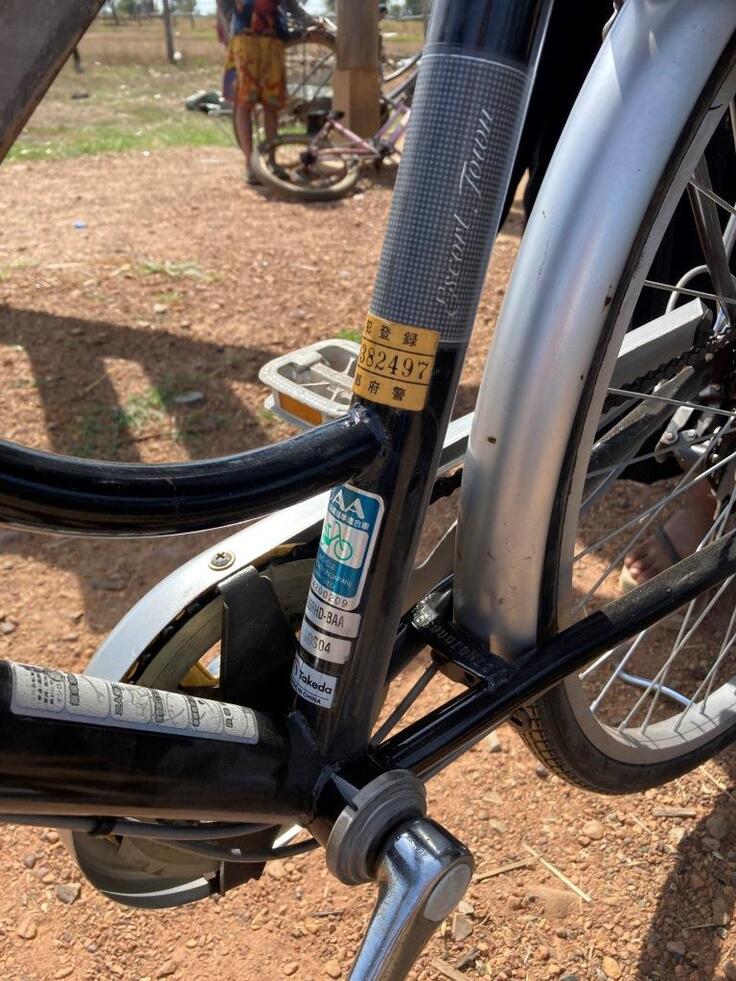 彼女の自転車も日本品質。防犯登録番号と品質保証シールがその印。「日本のいい自転車だから、あと10年は楽勝で乗れます」って伝えておきました!ちなみに所有者名は所属していた高校やマンションのシールまで貼ったままでした。京都の久御山高校出身のK君。あなたの自転車は今、カンボジアの北の果て、プレアヴィヘア州でがんばっています!!