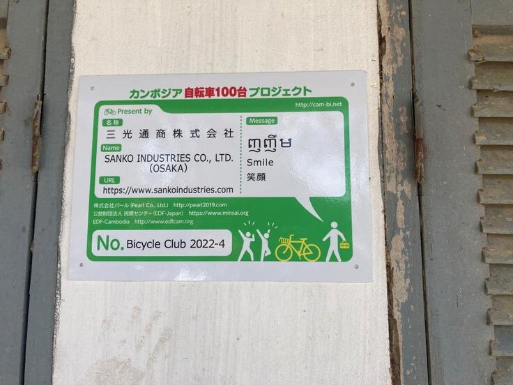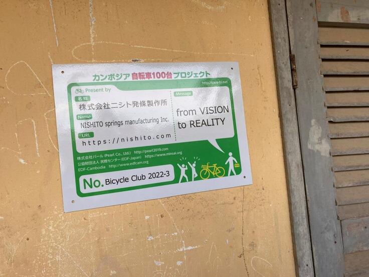 こちらの自転車クラブプレートにあります株式会社ニシト発條製作所さん。カンボジア自転車プロジェクトの1年目から支援していただいています。安田が所属する大阪府中小企業家同友会の仲間でもあり、いっつもお世話になっている西尾さんという方が今年専務に就任されたという記念に自転車クラブを設立してくださいました。