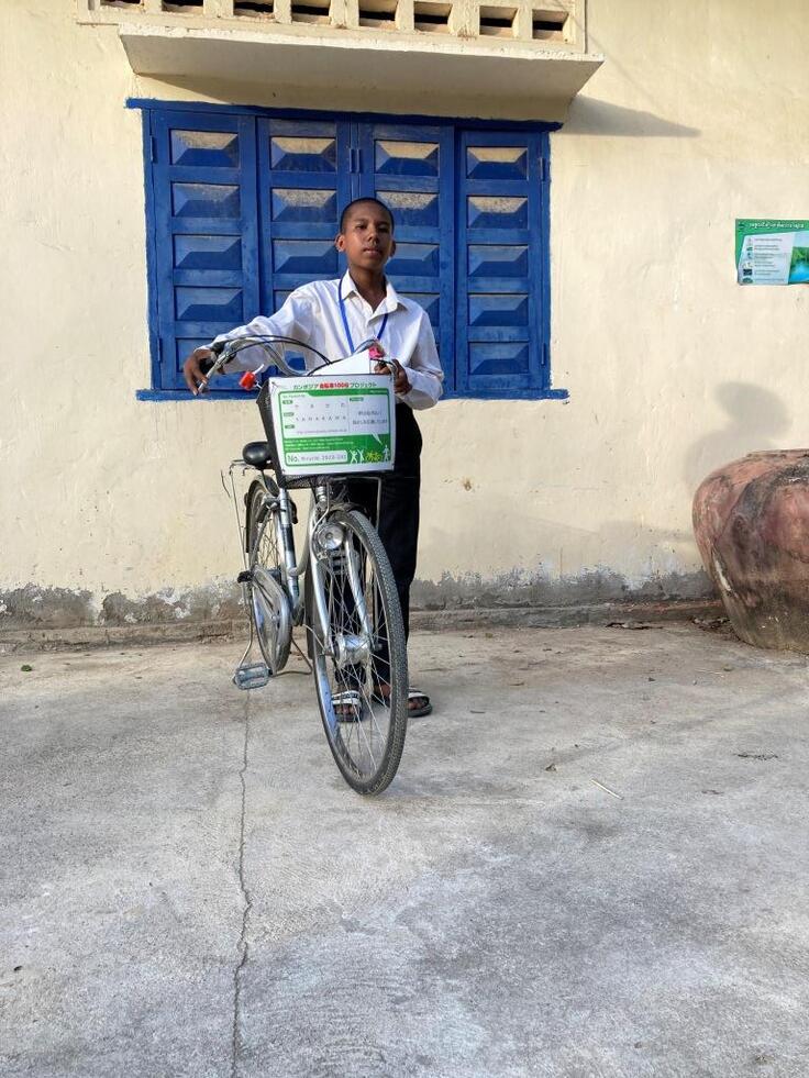 野球少年のように頭を丸めた彼。実は最近とっても悲しいことが起こりました。それは10日ほど前ことです。元気だったお父さんが朝起きてみると亡くなっていたそうです。「野球少年」なんて言ってすみません。カンボジアでは家族が亡くなると男の子(大人もかな?)は頭を丸める習慣があるそうです。これからはお母さんと兄弟3人と支え合って生きていくそうです。そんな大変なときではありますが、この自転車が彼の力になってくれることを願っています。