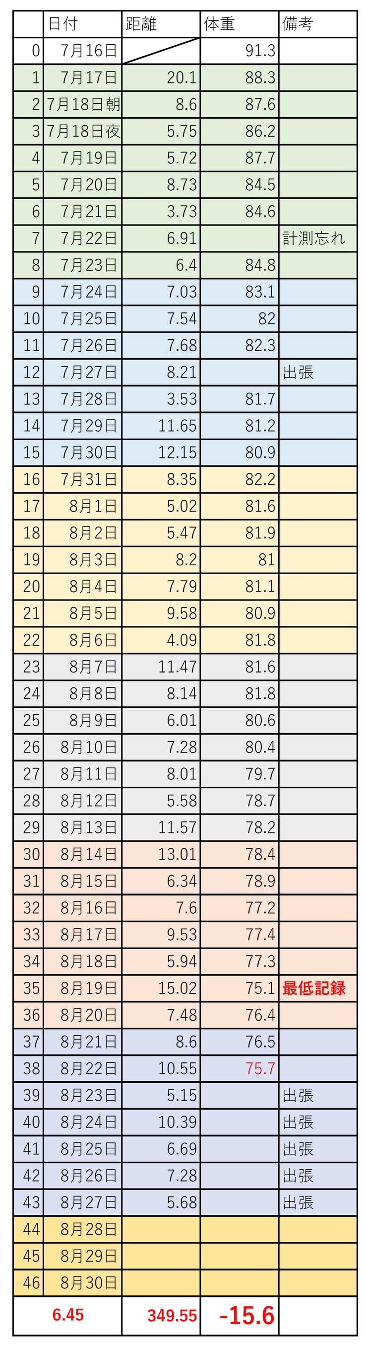8月22日を最後に1週間の出張にでかけました。帰るのは8月30日。そう、プロジェクトの最終日まで計測できないんです。食事節制とランニングの毎日ですが、どうなっていることやら・・・