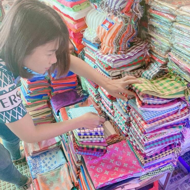 こちら、クロマー屋さんの店員さん。クメール語しか話しませんのでマブさんに同行いただいた次第です。めちゃくちゃスムーズに購入することができました。今回は50枚。デザインの選択はお任せですが、なるべくバラバラでくださいとお願いしました。