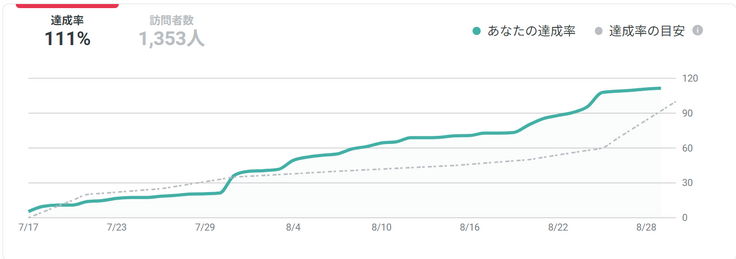 こちら、実行者の管理画面にあるグラフの1つです。緑の線が達成率の様子を表しています。7月末頃に大きなご支援をいただき、目安の点線のグラフを上回ることができました。それ以後、これまでのご支援者さんへのメッセージ送付を含めできること毎日毎日続けていきました。おかげさまでたくさんの方々からご支援をいただくことができました。