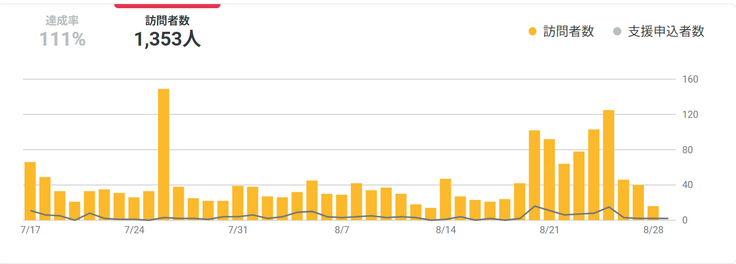 こちらがプロジェクトページへのアクセス数。アクセス数はご支援に直結するために、毎日新着情報を掲載し、それをFacebook、Instagram、Twitter、notesに告知し続けました。7月24日の週にアクセスが急増しているのはFMの「One Morning」さんにて取り上げられたときです。そして8月21日ごろからアクセスが伸びたのはREADYFORさんのトップページに「あと一押しプロジェクト」に出るようになったからです。