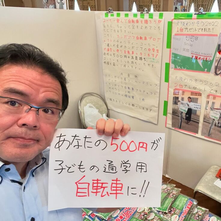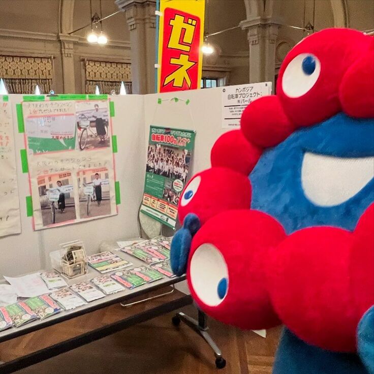 大阪といえば万博。会場にはミャクミャクも来てくれました。カンボジア自転車プロジェクトのブースの前を通過したときに写真を撮りました(#^^#) こちらの写真の机の上をご覧ください。在庫かなり減っていますでしょ。そして中央の募金箱にはたっぷりの協力金が。