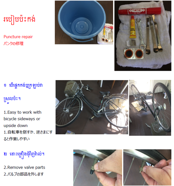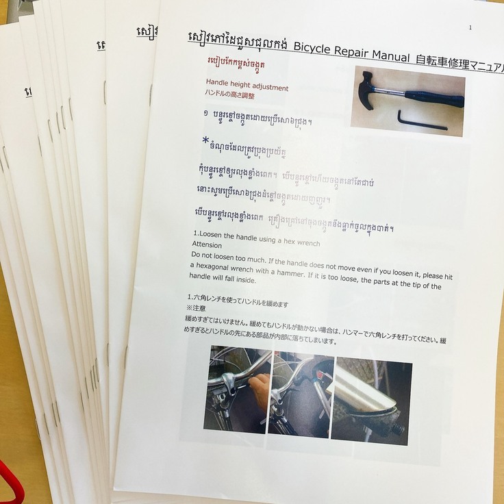 こちらがそのマニュアル。写真はその中の1ページです。パンク修理について説明しているのですが、特徴はカンボジアの言葉であるクメール語に併せて英語や日本語の表記をしていることです。支援することども達の一部は英語を勉強しているのでその一助になるかなぁというのと、あと外国の言葉に触れることで、そうした国に思いを馳せる機会になってくれればと思っています。