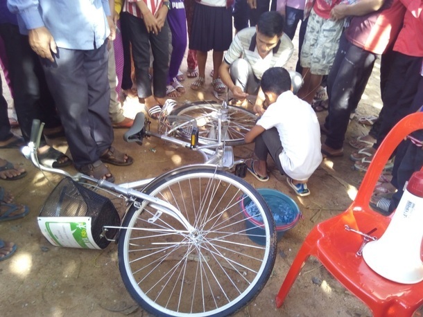 そう、カンボジアの農村エリアの道は未舗装です。石、ガラス、金属くずなどたくさん落ちているためすぐパンクしてしまうのです。修理キットと一緒にプレゼントしないとすぐに使えなくなってしまいます。