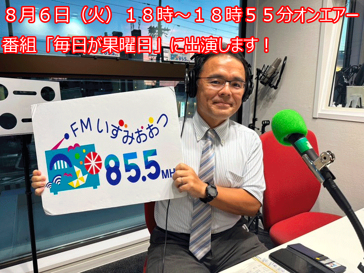 8月6日(火)FMいずみおおつの番組『毎日が果曜日』(番組ご提供:くだもの王国(有)アオイ農園さま)に生出演します!番組は18:00~18:55の55分間。