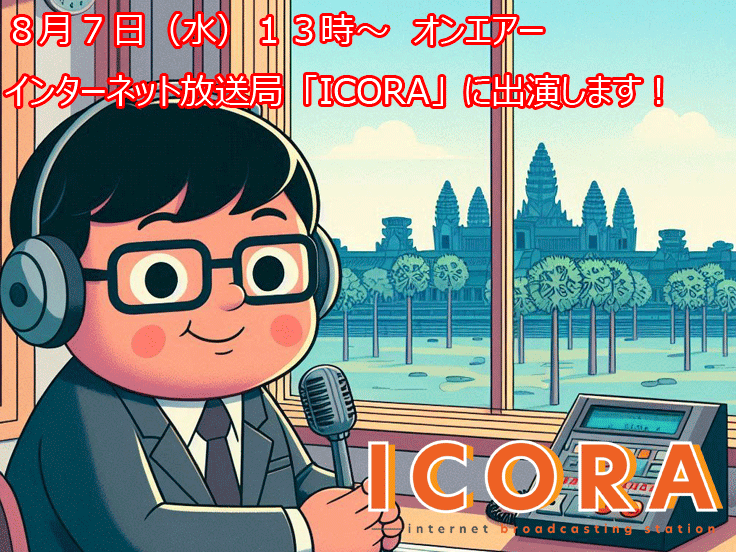 8月7日(水)13時より、インターネット放送局ICORAに出演します。