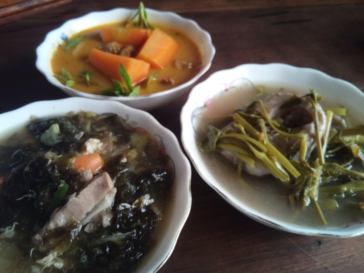 ここでお昼です。カンボジアのお昼はオカズを数品注文して、ご飯は食べ放題なスタイル。今回のおかずはこちら。わかめスープ、魚と空芯菜の煮物、人参と牛筋の煮込みです。