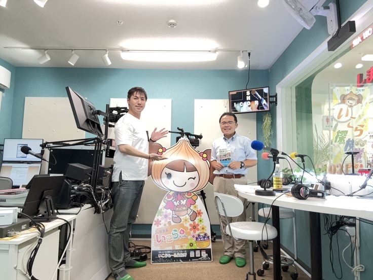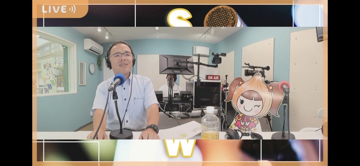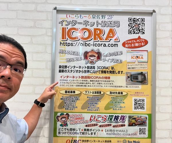 ICORAさんのホームページから見ました放映中の様子がこちらです。後ろにワンオペレーションで機械操作とパーソナリティを務められているのが今回お世話になりました濱田さんです。こちらの放送局は泉佐野市のショッピングモール「いこらもーる泉佐野」の中にありまして、ガラス張りのスタジオはお買い物客の方から丸見え状態。これまで体験したことのないシチュエーションにドキドキ緊張しました。