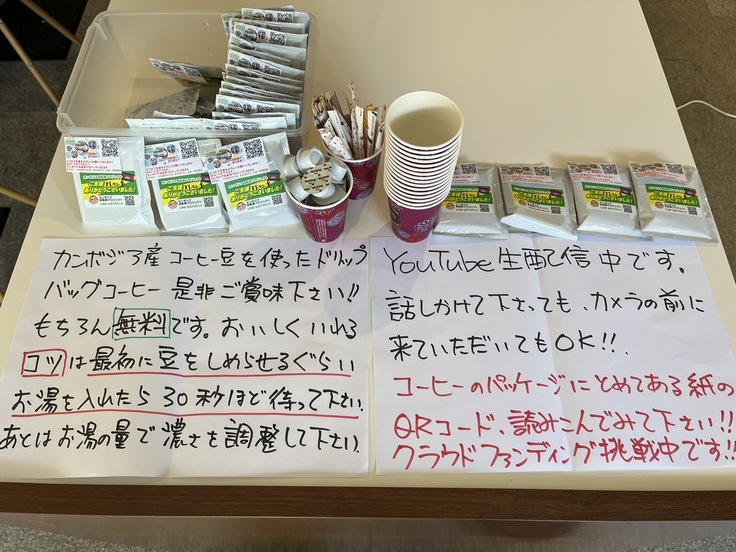 当日、カンボジア産コーヒー豆のドリップコーヒーバッグをお持ちいたしました。LiveCoalsに来られた方にもコーヒーをプレゼントいたしました。