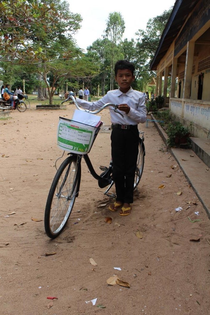 プレート取付などの準備が終わったら、順番に撮影。この時に撮影した写真がご支援者さんのもとに届きます。1対1でつながる支援。支援者さんの協力いただいたお金が何に使われているのかはっきりわかることが大切なので、この個別写真はカンボジア自転車プロジェクトのとても大切なリターンとなります。