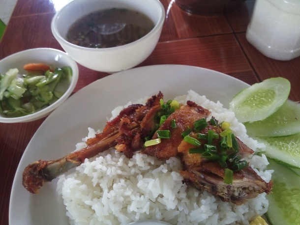 なんか走っていてもどうも調子が出ません。道路沿いの食堂で朝ごはんを食べることにしました。注文は指さし会話帳で。「ばーいさいっもあん」(鳥ごはん)を注文しました。出てきたのがこれ。
