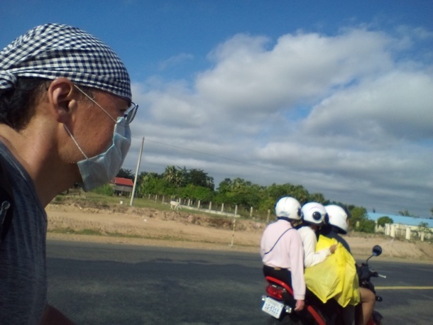 三人乗りバイクとのツーショット・・・暑い・・・そういえばカンボジアはバイクのヘルメット着用が年々厳しくなっていて、都心部ではほとんどみんな装着。こうした農村部エリアでもみんな着用していました。