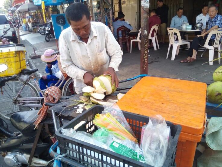 こちらがお弁当屋さん。おかずを選んでテンコモリのご飯と一緒で5000リエル。およそ150円ぐらいです。とってもリーズナブル。横ではドリンクを売っている人もいます。水、ジュース、そしてビール。でもカンボジアの鉄道は飲酒禁止です。でも買っている人いました。実際、中では缶ビールだとわからないように紙ナフキンで巻いて飲んでいました。でもジュースや水は誰も巻いていないので、巻いているものはビールだとすぐわかるのですが・・・