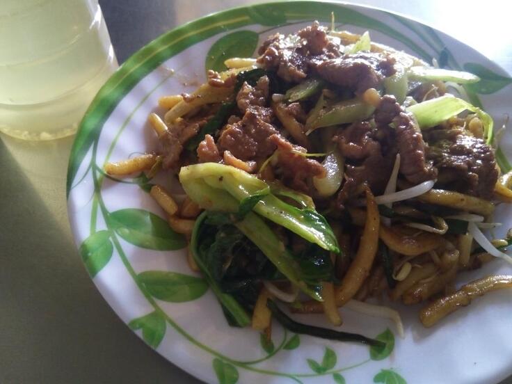 こちらブツブツに切れた状態の焼うどん。ホテルのすぐそばにあって安田のお気に入りです。いつもは卵乗せなんですが、今日はビーフにしました。これで1.5ドルです。